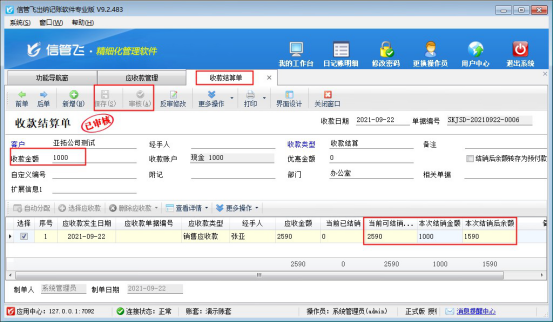 審核收款結算單后,返回至應收款管理界面,點擊“查詢”刷新,可看到結銷狀態由“未結銷”變為“部分結銷”,對應的已結銷金額變為1000元,未結銷金額為剩余的1590元,如下圖所示:
