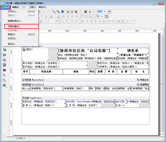 在打印格式設(shè)計界面,選擇打印格式模板點擊“設(shè)計格式”,進入打印格式設(shè)計器界面。在模板設(shè)計器中點擊左上角“文件”,彈出的界面上點擊“頁面設(shè)置”,進入頁面設(shè)置界面,如下圖所示: