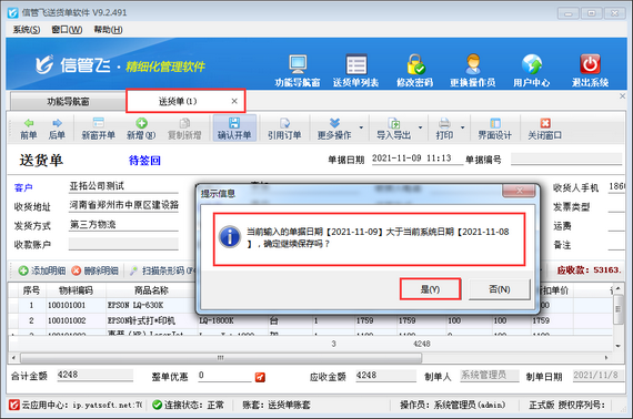 送貨單界面,修改單據日期為2021年11月9日,錄入單據主體和單據明細信息,點擊保存按鈕后,會彈出提示“當前輸入的單據日期【2021-11-09】大于當前系統(tǒng)日期【2021-11-08】,確定繼續(xù)保存嗎?”。如下圖所示: