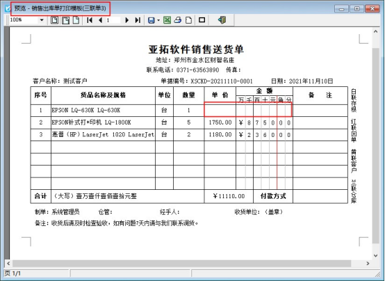 金額設置和單價一樣,設置完成保存模板,預覽模板可看到單價和金額的零值已顯示,如下圖: