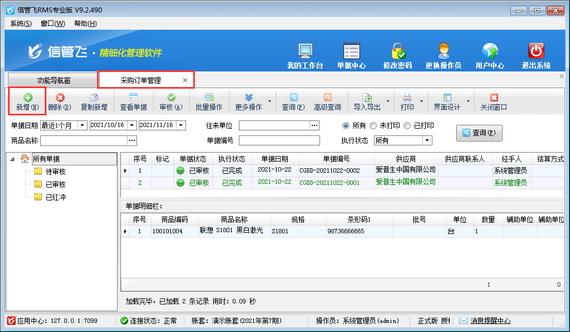 此時可以對采購訂單其他信息錄入,保存審核即可。另外可以新增采購入庫單引單采購訂單,進行采購商品入庫。