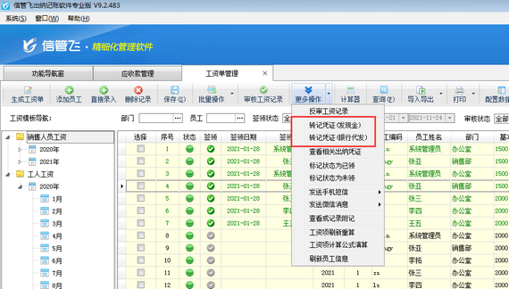 信管飛出納記賬軟件專業版包括工資管理功能,支持自定義工資模板,可根據設置的工資模板快速生成工資單,支持從上月工資單復制工資項目數據,每月工資發放后,可將工資記錄轉記為日記賬憑證,本文介紹一下出納記賬軟件中工資單如何轉記憑證?