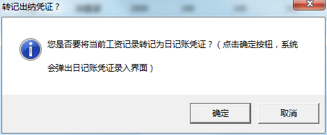 在功能導航窗點擊“綜合管理”—》“工資單管理”,打開工資單管理界面,在工資記錄列表中選擇需要轉記日記賬的工資記錄,然后點擊“更多操作”—》“轉記憑證(發現金)/轉記憑證(銀行代發)”,系統彈出提示信息“您是否需要將當前工資記錄轉記為日記賬憑證?”,如下圖所示。