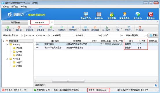 權限設置完成后,使用操作員“張亞”登錄軟件查看銷售單列表,可查看到銷售單單據僅為本部門人員所開數據,切換用“系統管理員”登錄可查看所有單據,如下圖所示: