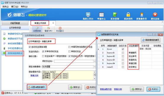功能導航窗點擊“系統(tǒng)管理”—》“單據(jù)業(yè)務(wù)參數(shù)”,選擇“微信消息參數(shù)設(shè)置”,選擇銷售出庫單,工具欄點擊“設(shè)置參數(shù)”,可設(shè)置發(fā)送時間點和接收對象,選擇微信消息模板(微信公眾號需提前申請好模板配置),微信消息模板選擇后需對應(yīng)軟件中的數(shù)據(jù)項,如下圖所示: