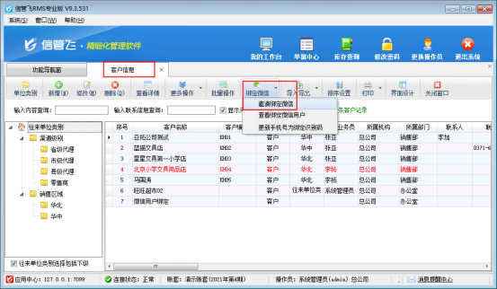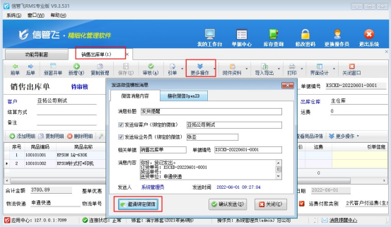 推送微信消息接收人員支持推送給業(yè)務(wù)員、客戶,業(yè)務(wù)員和客戶綁定操作支持在基礎(chǔ)資料“客戶信息”和“員工信息”中獲取綁定二維碼發(fā)送綁定,也可以直接開單界面“更多操作”下發(fā)送微信消息處點擊邀請客戶綁定微信,獲取綁定二維碼發(fā)送客戶進行綁定,如下圖所示: