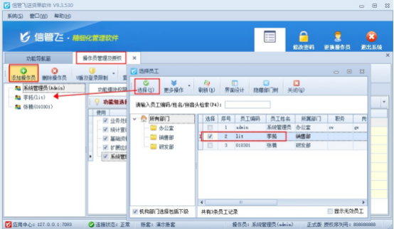 添加新的操作員,功能導航窗選擇系統管理—操作員及授權界面。點擊工具欄“添加操作員”,選擇員工信息中的“李拓”,選擇完成后,右側功能權限勾選需要的權限,保存設置則添加新的可登錄的操作員“李拓”,如下圖所示: