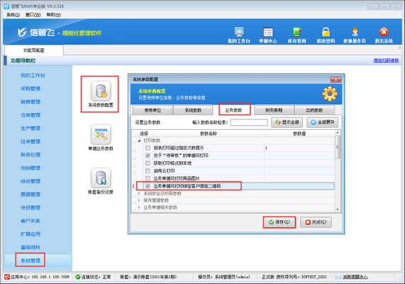 在功能導航窗點擊“系統管理”—》“系統參數配置”—》“業務參數”,在“打印參數”中啟用參數“業務單據可打印綁定客戶微信二維碼”,然后保存設置,如下圖所示。