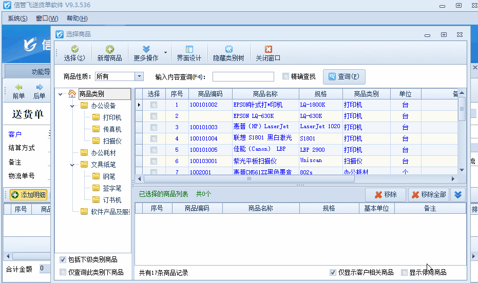 信管飛送貨單軟件開送貨單前可提前添加好商品信息到基礎(chǔ)資料中,新開送貨單選擇客戶后,選擇“添加明細(xì)”可彈出選擇商品界面,可選擇添加好的商品信息,有用戶反映在選擇商品界面,查詢窗口輸入商品簡寫不自動(dòng)過濾,需要點(diǎn)擊下查詢才會(huì)進(jìn)行檢索,如下圖所示: