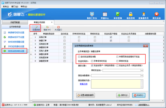 在功能導(dǎo)航窗點(diǎn)擊“系統(tǒng)管理”—》“單據(jù)業(yè)務(wù)參數(shù)”,在單據(jù)業(yè)務(wù)參數(shù)界面選擇微信消息參數(shù)設(shè)置,然后選擇需要設(shè)置的單據(jù),點(diǎn)擊“設(shè)置參數(shù)”即可設(shè)置自動(dòng)發(fā)送微信消息,可根據(jù)需求設(shè)置單據(jù)保存或者審核時(shí)自動(dòng)發(fā)送微信消息,同時(shí)也支持設(shè)置單據(jù)未填寫物流信息時(shí)不發(fā)送微信消息,如下圖所示: