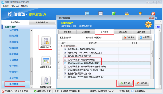 如何設(shè)置輸入商品時自動檢索,操作步驟如下,在功能導(dǎo)航窗點擊“系統(tǒng)管理”—“系統(tǒng)參數(shù)配置”,在“業(yè)務(wù)參數(shù)”的選擇參數(shù)中取消勾選參數(shù)“在選擇窗口可查看庫存數(shù)量”和“在選擇窗口可查看庫存可用數(shù)量”,然后保存設(shè)置,如下圖所示: