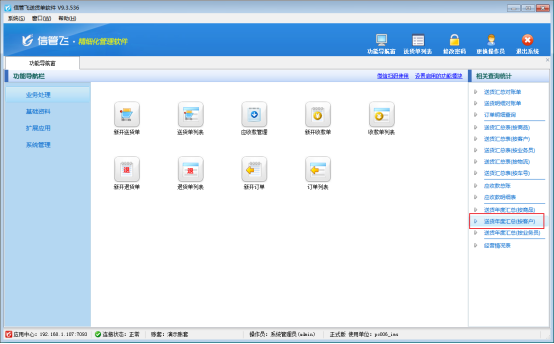 信管飛送貨單軟件為集訂單管理、送貨管理、收款結算等功能并支持送貨明細對賬及業務綜合對賬的送貨單打印軟件。軟件根據錄入的每張訂單及送貨單等數據,可以自動生成統計報表,完成企業銷售統計查詢和與客戶送貨明細對賬的目的,如下圖所示。