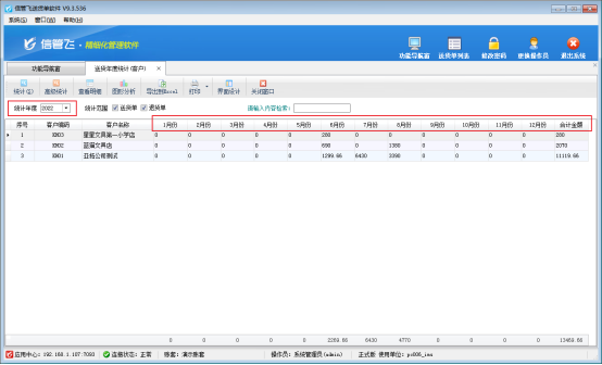 在功能導航窗點“業務處理”,軟件最右側相關查詢統計中點擊“送貨年度匯總(按客戶)”,進入“送貨年度匯總(按客戶)”統計界面,如下圖所示: