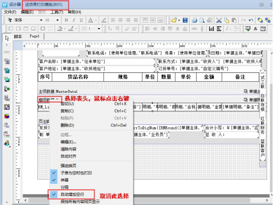 模板設計器界面。選擇細項數據表頭,鼠標右鍵取消選擇“自動增加空行”預覽會不顯示空白格,然后替換“頁注腳”為“數據注腳”(頁注腳是在每頁頁尾顯示,中間有空白行不會連接明細項),如下圖所示: