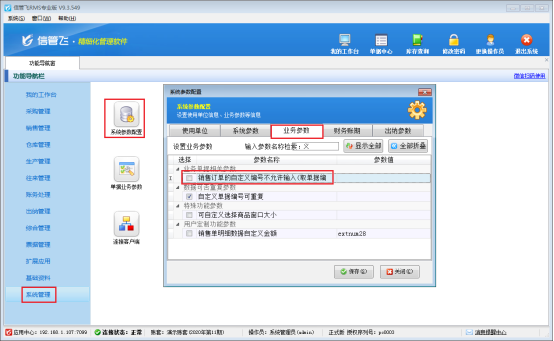 在功能導航窗點擊“系統管理”—》“系統參數設置”—》“業務參數”,然后在業務單據相關參數中取消勾選“銷售訂單的自定義編號不允許輸入(取單據編號)”參數,之后點擊保存按鈕,如下圖所示: