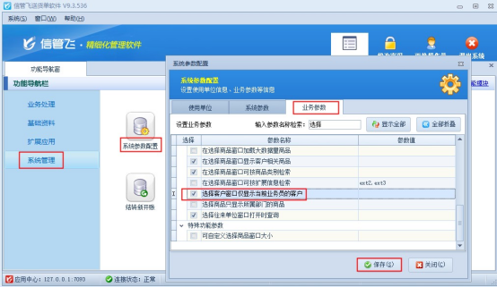 在功能導(dǎo)航窗點(diǎn)擊“系統(tǒng)管理”—》“系統(tǒng)參數(shù)配置”,“業(yè)務(wù)參數(shù)”中數(shù)據(jù)擇參數(shù)啟用參數(shù)“在選擇窗口僅顯示當(dāng)前業(yè)務(wù)員的客戶”,保存配置,如下圖所示: