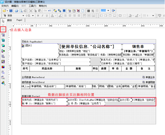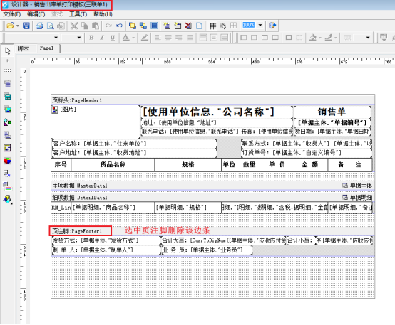 導航欄選擇“業務處理”—》“新開訂單”—》打印—》打印格式設計—》設計格式,進入打印模板的設計器界面,選中“頁注腳”刪除該邊條,在該位置添加數據注腳,如下圖所示: