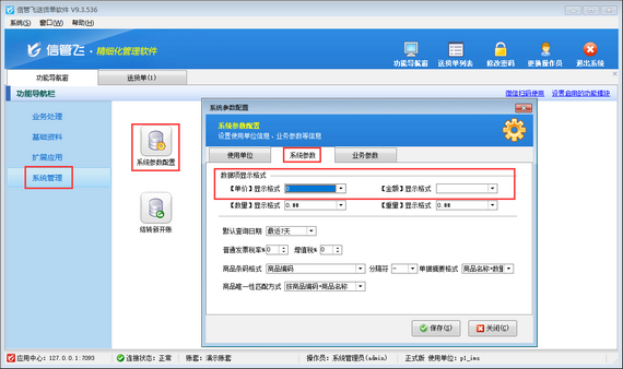 第二、在軟件功能導航窗點擊“系統管理”—》“系統參數配置”,打開系統參數界面,檢查“單價”、“金額”顯示格式設置,如單價或者金額顯示格式設置為空,單據無法保存,如下圖所示。
