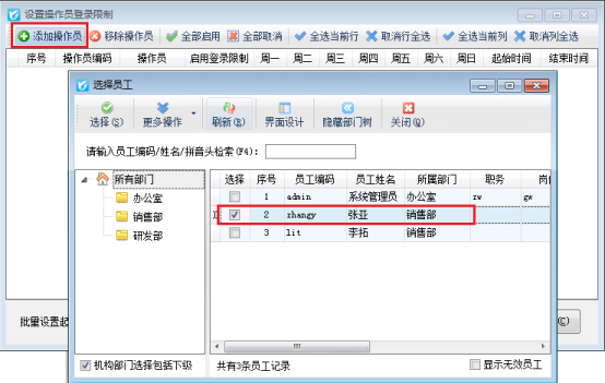 設置操作員登錄限制時,可以批量對多個操作員設置起始與結束時間。