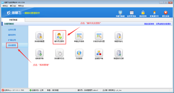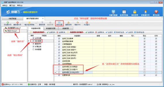 用系統管理員賬號登錄軟件,在功能導航窗點擊“系統管理”—》“操作員及授權”,進入“操作員管理及授權”界面,選擇操作員賬號“張亞”,在其右側的功能模塊權限內選擇“統計查詢”,將年度匯總的“使用”權限勾選取消,然后保存設置,如下圖所示。