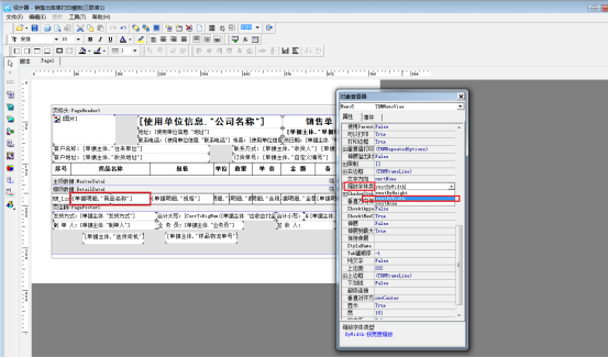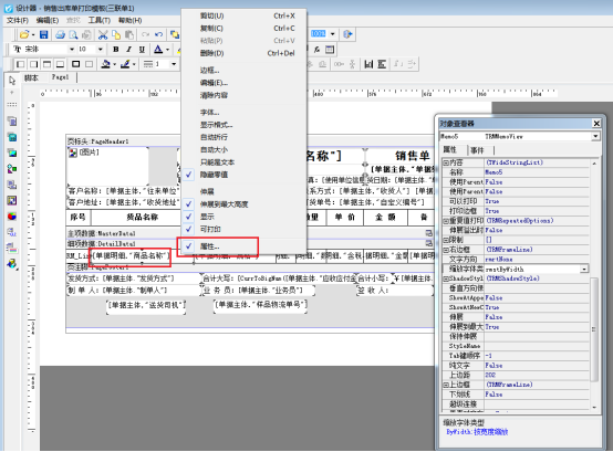 在開單界面,點擊打印—》“打印格式設計”,在打印格式設計界面,選中需要修改的模板,點擊“設計格式”,可進入模板設計器界面,選中細項數據處商品名稱文本框,鼠標右鍵顯示出屬性,在屬性處找到“縮放字體類型”,選擇“rmstByWidth”屬性,如下圖所示: