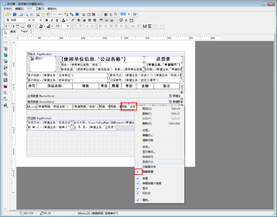 菜單欄點(diǎn)打印—》打印格式設(shè)計(jì)—》設(shè)計(jì)格式,進(jìn)入打印模板設(shè)計(jì)器界面,選中單價(jià)、金額明細(xì)欄,鼠標(biāo)右鍵勾選隱藏零值,勾選之后點(diǎn)擊保存。