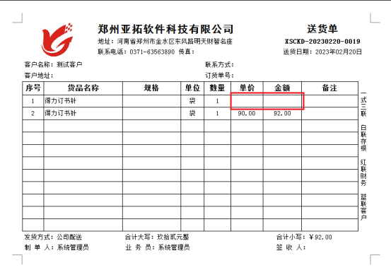 信管飛RMS軟件、信管飛倉(cāng)庫(kù)管理軟件、信管飛送貨單軟件等支持自定義設(shè)計(jì)打印模板,送貨單軟件中自帶了十幾種打印模板樣式,部分用戶在設(shè)計(jì)模板時(shí)需要單據(jù)單價(jià)、金額為0時(shí),模板中零值不顯示,以送貨單軟件為例設(shè)置下打印模板明細(xì)欄如何不顯示零值。未調(diào)整前打印模板顯示如下: