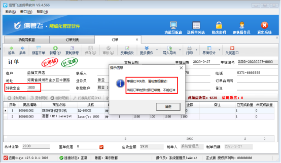 存在預收定金并已結銷的已完成狀態的訂單,紅沖單據的時候會提示“紅沖單據失敗,當前訂單的預付款已結銷,不能刪除”如下圖所示: