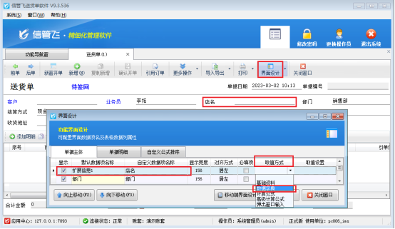有用戶存在多家門店的情況,需要按照每家門店進(jìn)行明細(xì)匯總統(tǒng)計(jì)。以“送貨明細(xì)對賬單”為例,示范下如何在界面設(shè)計(jì)中配置。首先在功能導(dǎo)航窗選擇“業(yè)務(wù)處理”進(jìn)入新開送貨單界面,點(diǎn)擊“界面設(shè)計(jì)”按鈕,在打開的界面設(shè)計(jì)窗口中找到“擴(kuò)展信息1”數(shù)據(jù)項(xiàng),可自定義列名為店名,擴(kuò)展信息1(店名)可以使用數(shù)據(jù)字典維護(hù),開單方便直接選擇,如下圖所示: