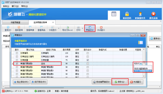 功能導(dǎo)航窗選擇“業(yè)務(wù)處理”在右側(cè)的查詢統(tǒng)計(jì)下打開“送貨明細(xì)對賬單”進(jìn)入送貨單明細(xì)查詢界面,點(diǎn)擊“界面設(shè)計(jì)”按鈕,在打開的界面設(shè)計(jì)窗口中找到“擴(kuò)展信息1”數(shù)據(jù)項(xiàng),勾選顯示并在可查詢處設(shè)置“可作為模糊查詢條件”,然后保存設(shè)置,如下圖所示: