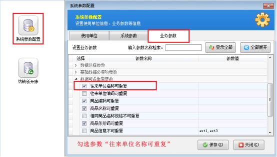 以信管飛RMS為例,在系統管理—》系統參數配置—》業務參數中的“數據可重復參數”勾選“往來單位名稱可重復”,然后保存設置。如下圖所示: