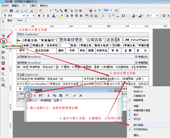 需要金額小計在每一頁顯示,在模板設(shè)計器界面,點擊左側(cè)工具欄的第一項,選擇“插入計算文本框”,添加到合適位置處,雙擊文本框,輸入文字“金額小計:”,點擊插入數(shù)據(jù)字段,選擇數(shù)據(jù)項“單據(jù)明細(xì)·金額”,選中計算文本框右鍵點擊“統(tǒng)計類型”如下圖所示: