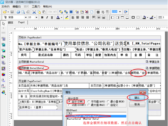 在屬性界面統(tǒng)計類型選擇“合計”后,統(tǒng)計選擇“DetailDatal”,然后點擊確定如下圖所示: