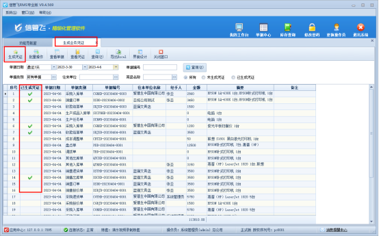 支持選擇單個單據點擊“生成憑證”進行憑證生成操作,也可以在“批量操作”模式下批量選擇單據進行批量生成,生成憑證后在已生成憑證狀態會以“√”顯示。如下圖所示: