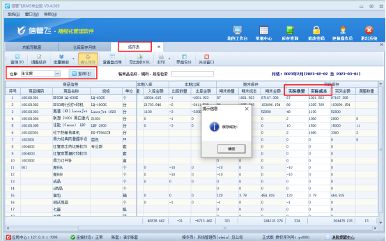 結存成功后,在倉庫庫存月結界面生成一個“已結存”的記錄。選擇“已結存”的結存記錄。點擊工具欄“查看結存表”,可進入“結存表”界面,在結存表界面,需要調整庫存數量和庫存成本,選擇需要調整的倉庫,點擊“查詢”刷新,在實際庫存中直接修改“實際數量”和“實際成本”,修改后會自動生成已審核的盤點單,如下圖所示: