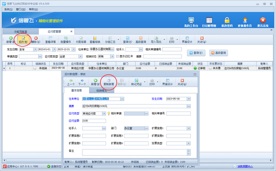 選擇需要被復制的房租應付款信息,工具欄點擊“修改”按鈕,在打開的“修改應付款信息”窗口點擊“復制新增”按鈕可復制生成一個一模一樣的應付款信息,復制生成的新的應付款信息需要修改后進行保存,如下圖所示。