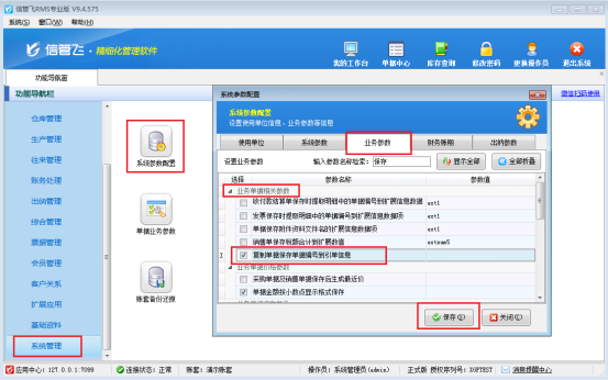 在功能導(dǎo)航窗點(diǎn)“系統(tǒng)管理”—》“系統(tǒng)參數(shù)配置”進(jìn)入“系統(tǒng)參數(shù)配置”界面,業(yè)務(wù)參數(shù)下找到“業(yè)務(wù)單據(jù)相關(guān)參數(shù)”,勾選“復(fù)制單據(jù)保存單據(jù)編號(hào)到引單信息”,設(shè)置后點(diǎn)擊“保存”按鈕。