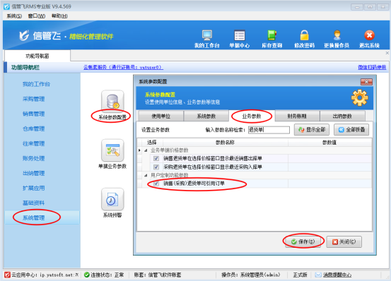 首先需啟用參數,功能導航窗點擊系統管理—系統參數配置,業務參數中勾選啟用參數“銷售(采購)退貨單可引用訂單”,保存參數設置,如下圖所示: