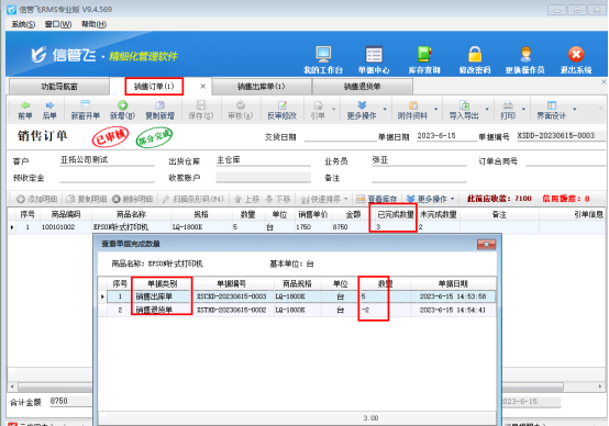 參數設置完成后,銷售訂單商品“EPSON針式打印機”訂單數量為5,銷售出庫單引用此訂單出庫5個,訂單執行狀態變為已完成。銷售退貨單引單銷售訂單開單,退貨2個,在銷售訂單界面可查看到訂單未完成數量變為2(等于退貨數量),查看訂單已完成數量可查看單據完成數量記錄,訂單執行狀態變更為部分完成。如下圖所示: