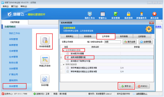 在功能導航窗點擊“系統管理”—》“系統參數配置”—》“業務參數”,業務單據相關參數下,打勾“啟用消息提醒功能”,保存設置,如下圖所示:
