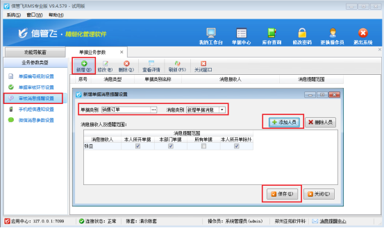 在功能導航窗點擊“系統管理”—》“單據業務參數”—》“審核消息提醒設置”,在此界面增加消息接收人員“張亞”及提醒范圍,如下圖所示: