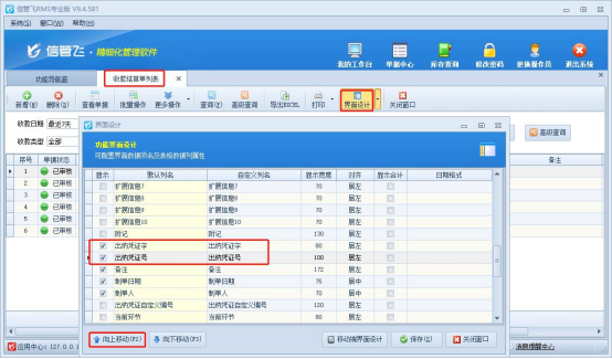 功能導(dǎo)航窗點擊“往來管理”—“收款結(jié)算單”進入收款結(jié)算單列表界面,工具欄打開“界面設(shè)計”,勾選顯示“出納憑證字”“出納憑證號”,并點擊向上移動至合適位置,保存界面設(shè)計,如下圖所示: