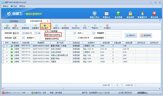 界面設(shè)計保存后在收款結(jié)算單列表界面顯示出“出納憑證字”和“出納憑證號”兩列,在工具欄更多操作下點擊“刷新列表中出納憑證”,刷新后在列表界面轉(zhuǎn)記過出納憑證的會顯示憑證字和憑證號,顯示空白的則未轉(zhuǎn)記過出納憑證,如下圖所示: