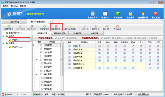 刪除操作員:選中已存在權(quán)限組下的操作員“李拓”,點(diǎn)擊“刪除操作員”按鈕。如下圖所示: