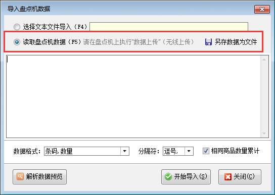 點擊“選擇文本文件導入”選項,然后選擇盤點機數據文件。盤點機數據文件選擇好之后,根據已選的盤點機數據文件數據內容設置數據格式及分隔符信息,然后點擊“開始導入”按鈕導入數據即可。如下圖所示。