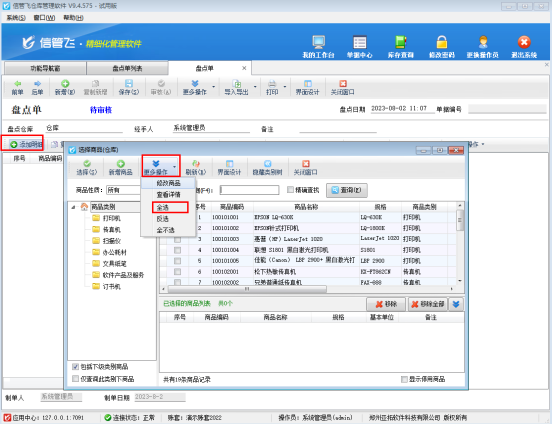 功能導航窗點擊倉庫管理,打開盤點單界面。選擇倉庫后,添加明細界面可全選商品,如果商品比較多建議分批盤點,如下圖所示: