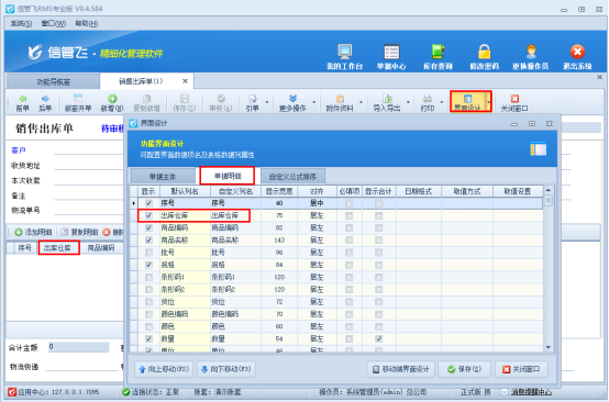 功能導航窗點擊銷售管理—》銷售出庫單,在銷售出庫單界面點擊工具欄“界面設計”,選擇單據明細項,勾選顯示出庫倉庫,保存界面設計,如下圖所示: