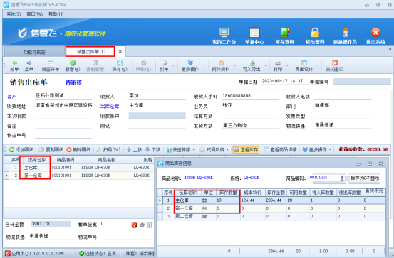 保存審核銷售出庫單,商品出庫數量分別為1個,審核后再次打開明細工具欄“查看庫存”,可看到商品的兩個倉庫數量分別減去一個,按照明細倉庫進行出庫,如下圖所示: