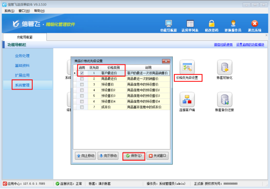 在功能導航窗點擊“系統管理”—“價格優先級設置”,在價格優先級設置中勾選啟用“客戶最近價”并向上移動到第一位,然后保存商品價格優先級設置。如下圖所示: