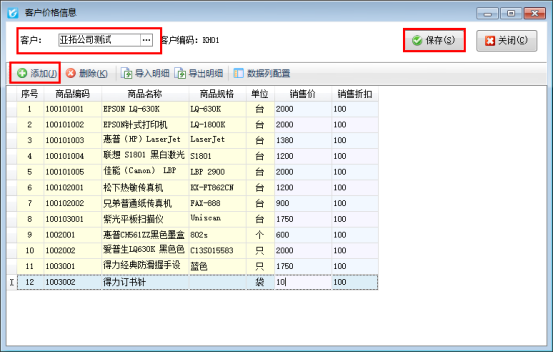 功能導航窗點擊“基礎資料”,打開“客戶價格信息”界面,點擊“新增”按鈕下的“按客戶添加價格信息”,彈出的客戶價格信息界面,先選擇客戶,然后點擊“添加明細”添加商品信息,輸入銷售價(支持導入操作),輸入完成點擊保存按鈕。如下圖所示: